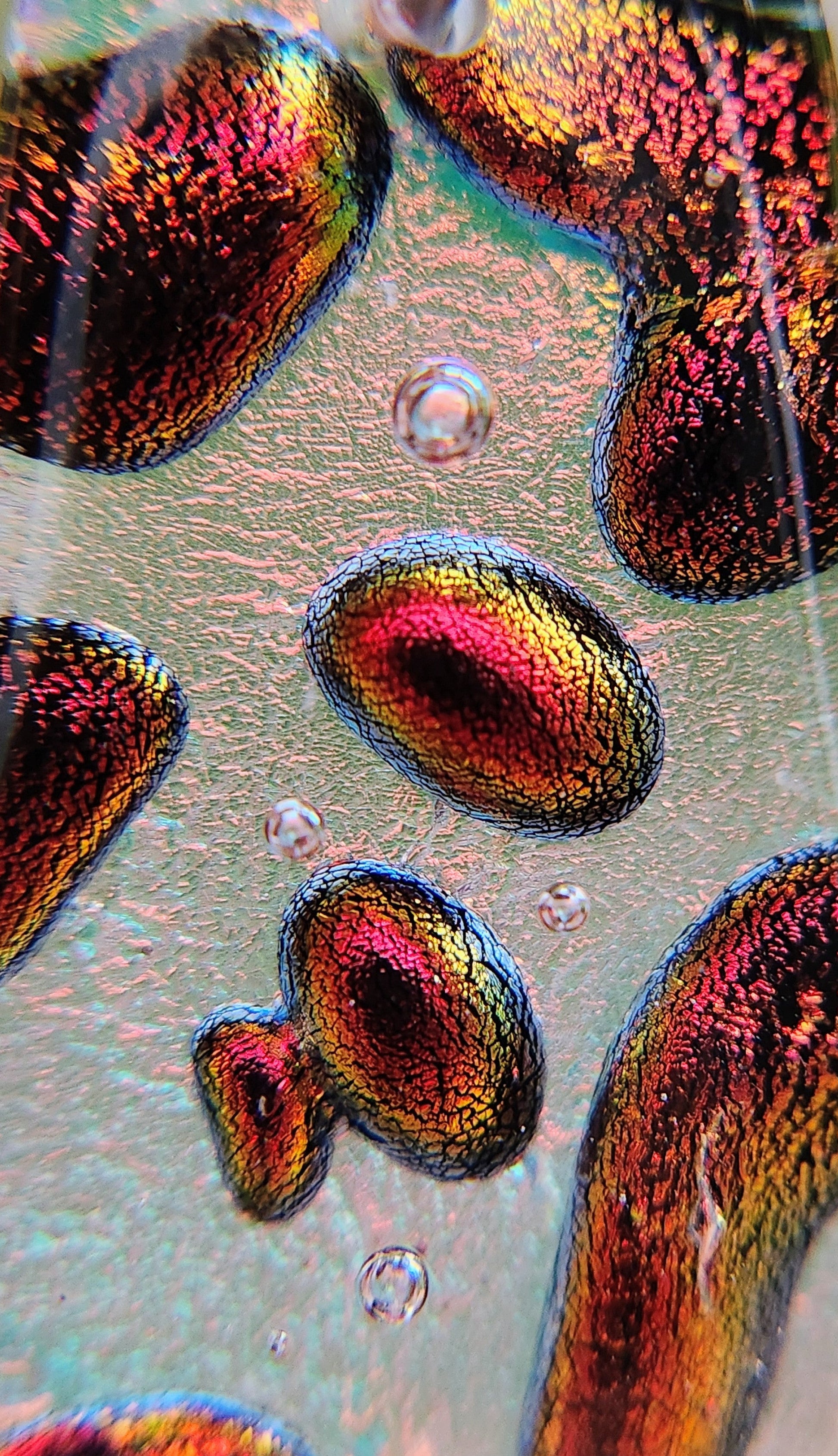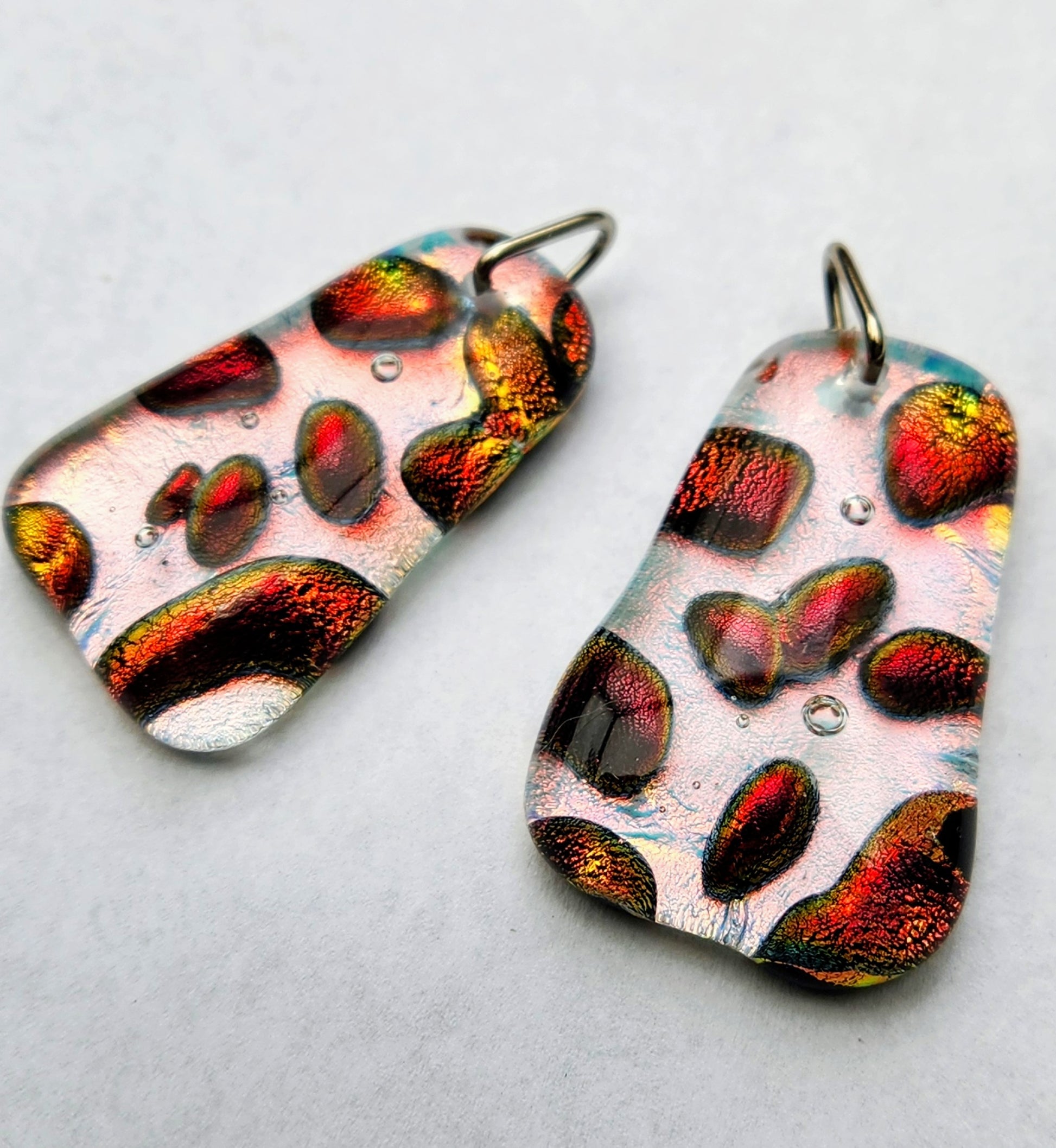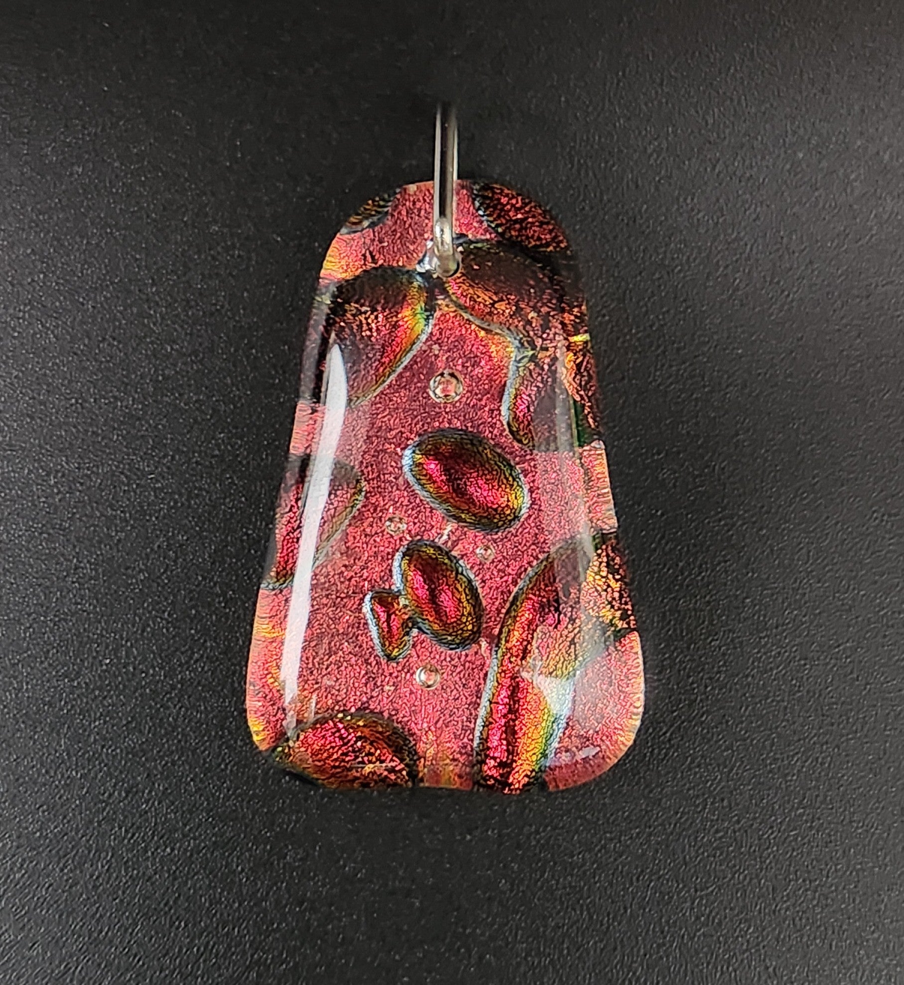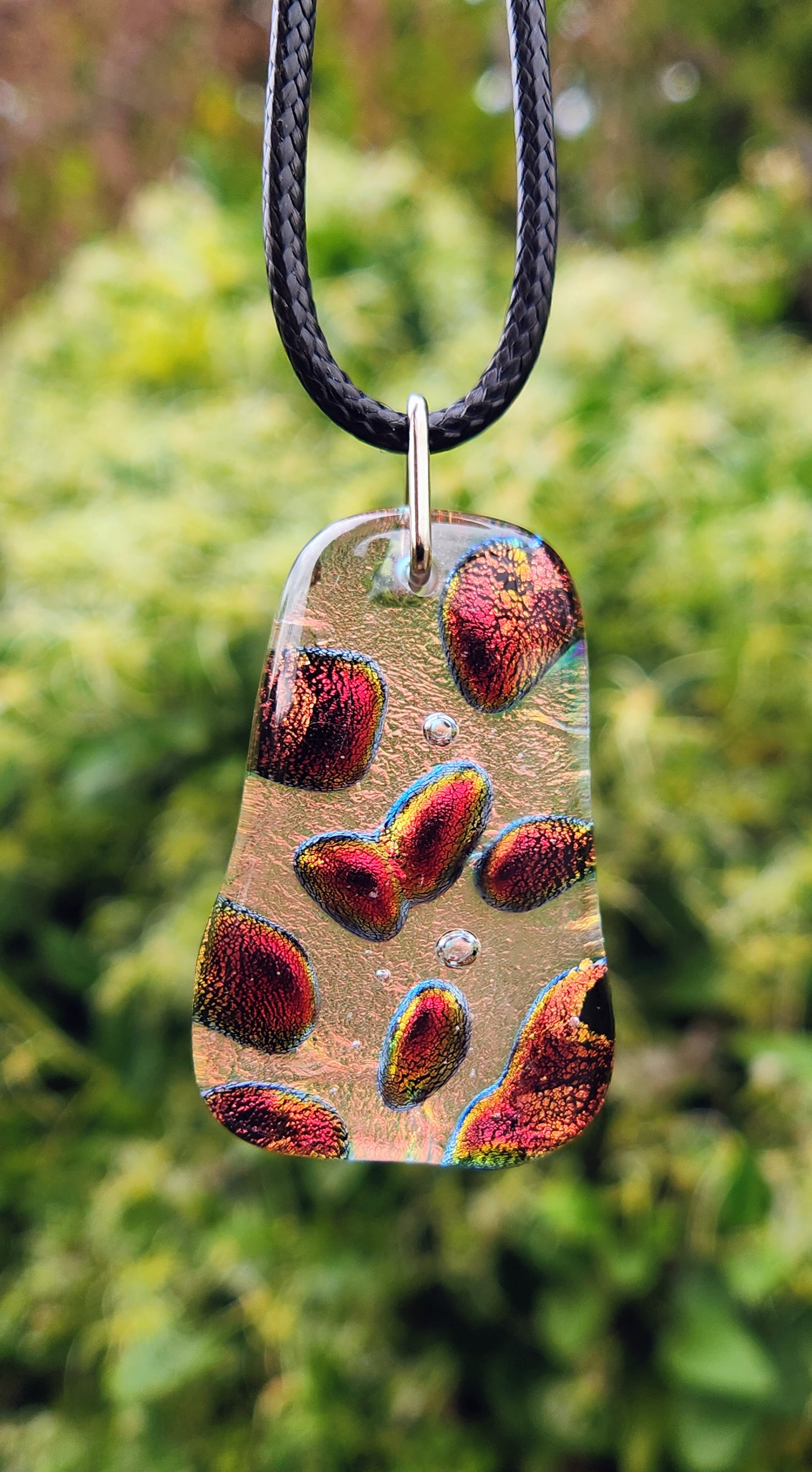 Ember Drift is a vibrant glass pendant featuring sparkling dichroic red droplets and air bubbles frozen in time. Its lively design adds a burst of energy to your look, making it the perfect accessory to brighten any day with a touch of fun and flair.