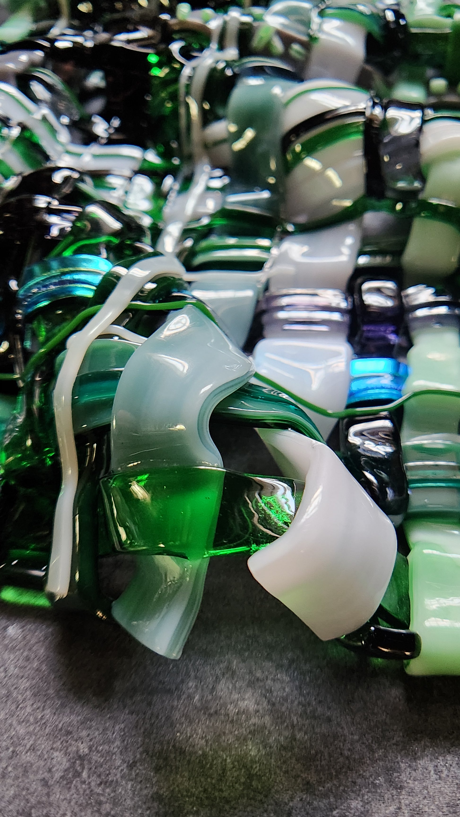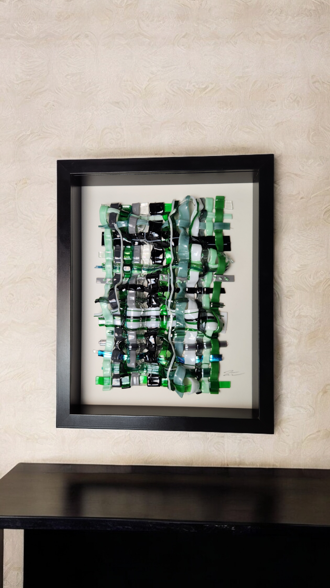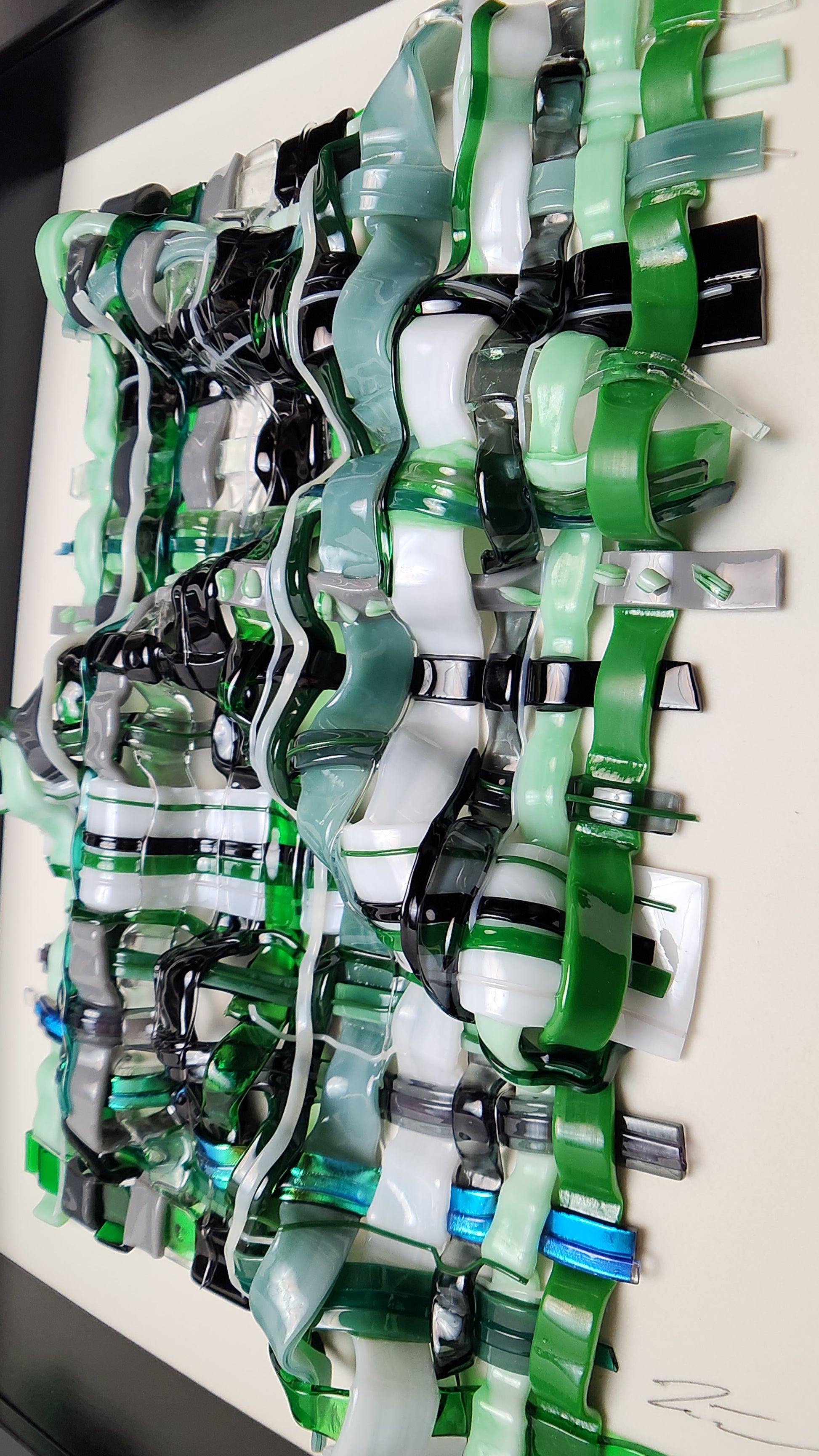 Handcrafted from individual glass strips, Undergrowth captures the layered feel of a forest floor. Shades of green, black, gray, and white twist together in an organic rhythm that feels alive and growing.